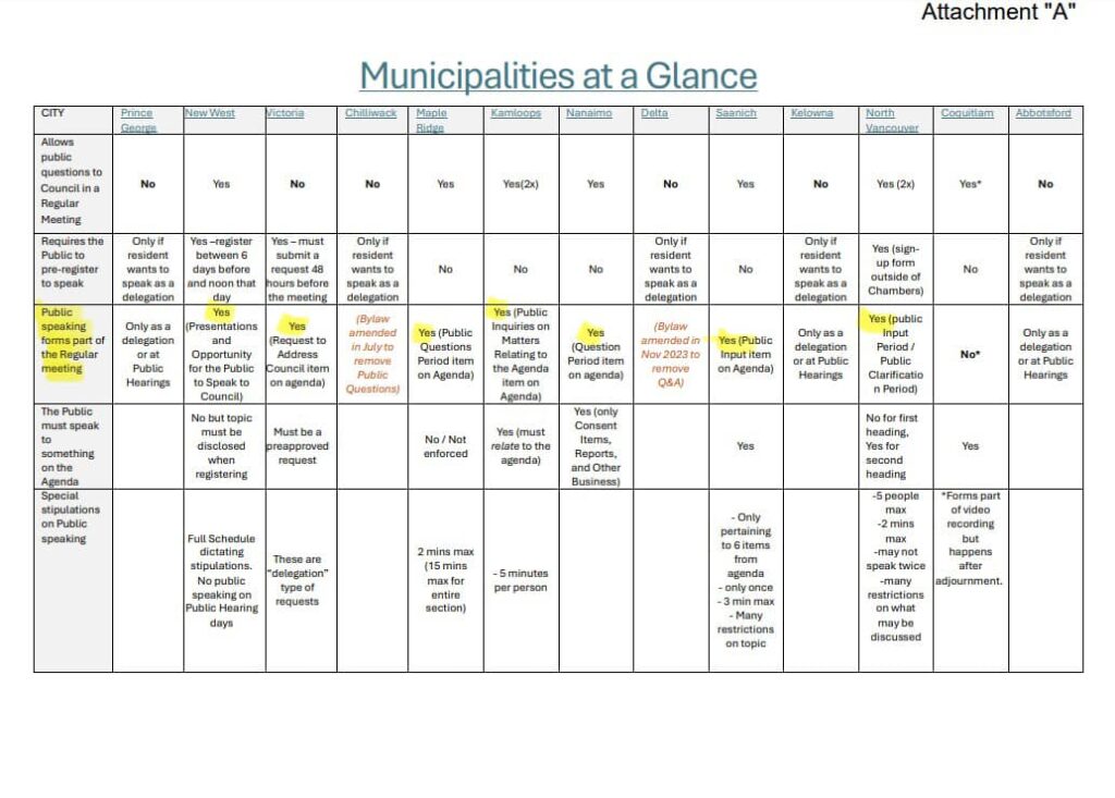 We would like to call attention to the fact that the spreadsheet done by the city of Kamloops shows that 70% of the BC municipalities listed-have Public Enquiries on their agendas-as per line 3. This number is different from line 1-that pertains to Q & A sessions. (Photo below.)
