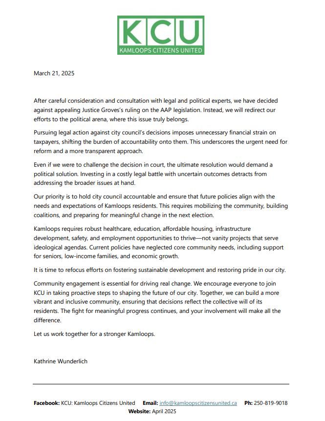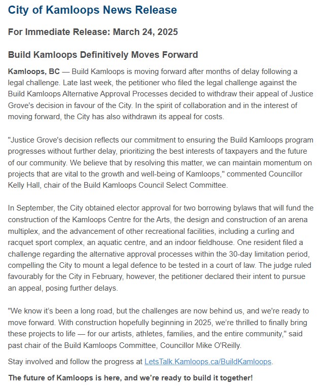-Kelly Hall’s spin on the events surrounding the appeal is just that-spin. Justice Grove’s decision did not “reflect their commitment to ensuring the Build Kamloops program progresses without further delay”.