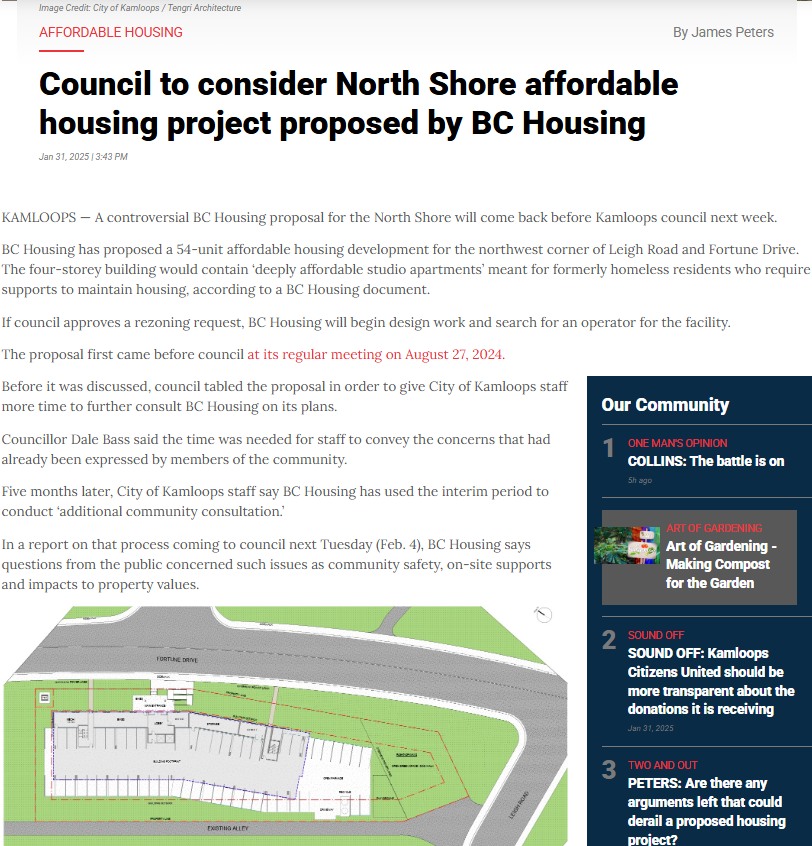 A rezoning application for a 54-unit BC Housing supportive wet housing facility at 327 Fortune Drive, 321 Fortune Drive, and 285 Leigh Road is going before Kamloops City Council this Tuesday, February 4.