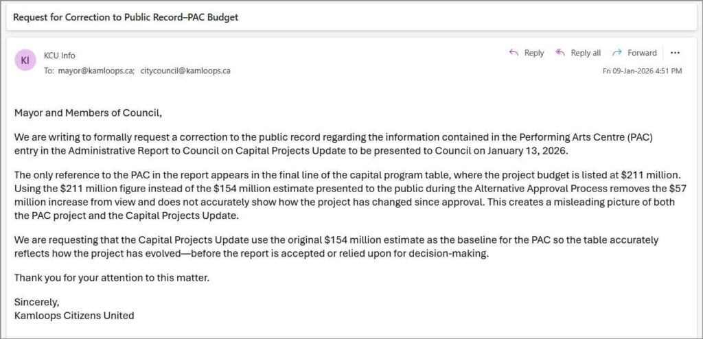 Presenting a major cost increase as settled and unproblematic contradicts the City’s own capital delivery data, presented at a recent Committee of the Whole meeting, which shows Kamloops already struggles to complete the projects it plans—putting essential services, other infrastructure projects, and taxpayers at risk.